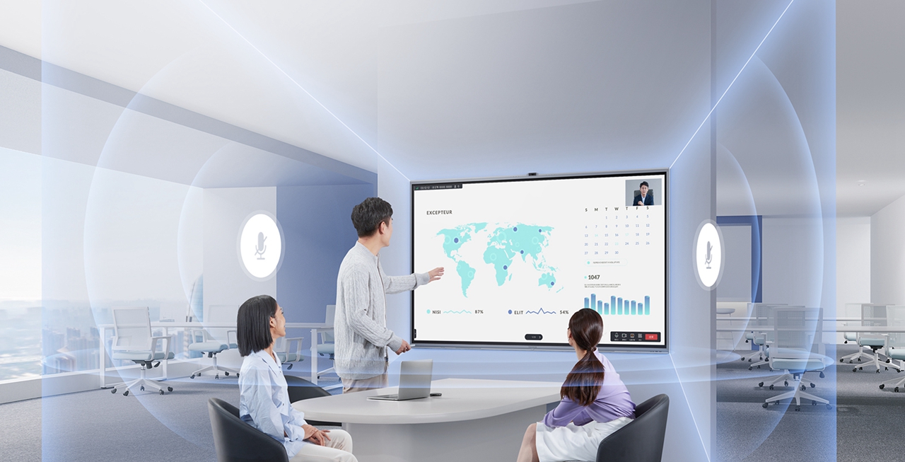 Về âm thanh, thiết bị sở hữu hệ thống loa 2.1 kênh dạng khe hướng mặt trước, tái tạo âm thanh mạnh mẽ và rõ ràng, lý tưởng cho môi trường họp hoặc lớp học. Camera 50MP siêu nét tích hợp kết hợp cùng mảng 8 micro hỗ trợ AI cho khả năng lọc nhiễu, khử vang và thu âm chính xác, đảm bảo trải nghiệm họp trực tuyến luôn chuyên nghiệp và rõ ràng.