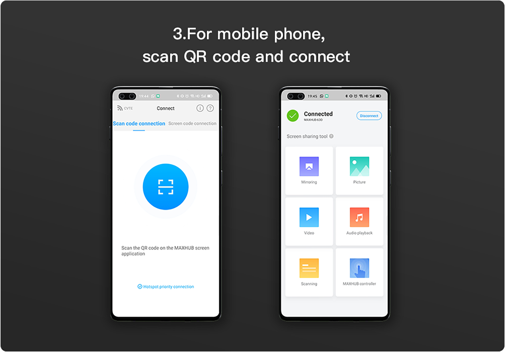 Chia sẻ theo ứng dụngPhần mềm chia sẻ màn hình MAXHUB Share cho phép chia sẻ màn hình không dây từ máy tính xách tay, điện thoại và máy tính bảng. Sau khi kết nối với điểm phát sóng bảng điều khiển MAXHUB, chỉ cần nhập mã chia sẻ và bạn đã sẵn sàng.